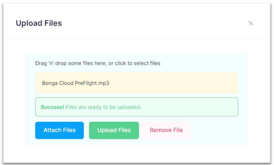 Step 3: Once an audio is selected, click on the Upload Files button to complete the upload process. On success, you will see a notification status affirming your actions.